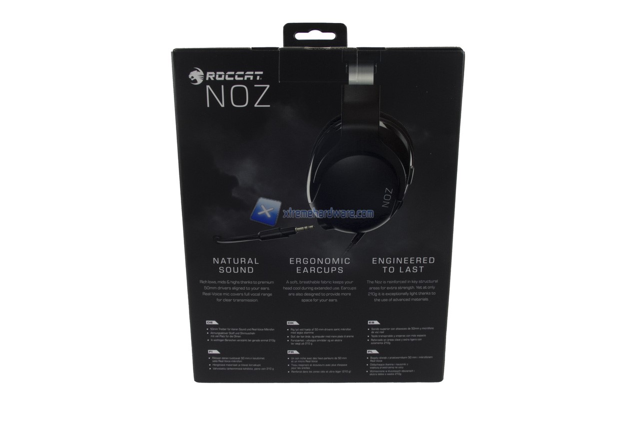 Le Roccat Noz giungono in una classica confezione di cartone di media dimensioni con una grafica molto semplice ed elegante. Sono riportate le principali caratteristiche e alcune immagini illustrative del prodotto.